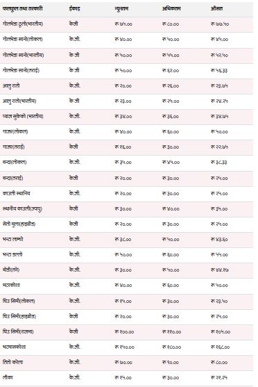 समितिले गोलभेँडा ठूलो (भारतीय) प्रतिकिलो ८०, गोलभेँडा सानो (लोकल)प्रतिकिलो ५०, गोलभेँडा सानो (भारतीय) प्रतिकिलो ५५, गोलभेँडा सानो (तराई) प्रतिकिलो ६५, आलु रातो प्रतिकिलो २६ र आलु रातो (भारतीय) प्रतिकिलो २५ र प्याज सुकेको (भारतीय) प्रतिकिलो ३७ रुपैयाँ रहेको जनाएकाे हाे ।
