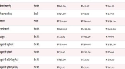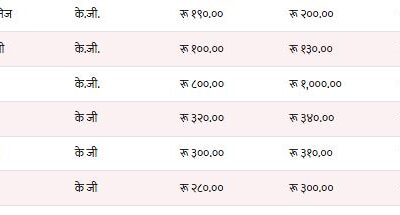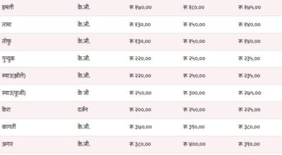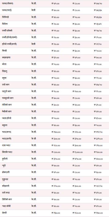 त्यसैगरी, गाजर (लोकल) प्रतिकिलो ६०, गाजर (तराई) प्रतिकिलो ३०, बन्दा (लोकल) प्रतिकिलो ४५, बन्दा (तराई) प्रतिकिलो ३०, काउली स्थानीय प्रतिकिलो ३०, काउली स्थानीय (ज्यापु) प्रतिकिलो ४०, सेता मूला प्रतिकिलो ३०, सेतो मूला (हाइब्रिड) प्रतिकिलो ३०, भन्टा लाम्चो प्रतिकिलो ५० र भन्टा डल्लो प्रतिकिलो ६० रुपैयाँ कायम गरिएकाे छ ।